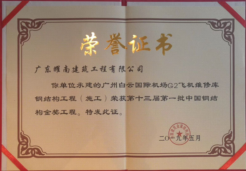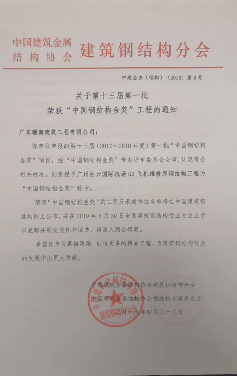 廣州白云國際機場G2飛機維修庫鋼結構工程榮獲第十三屆第一批“中國鋼結構金獎”