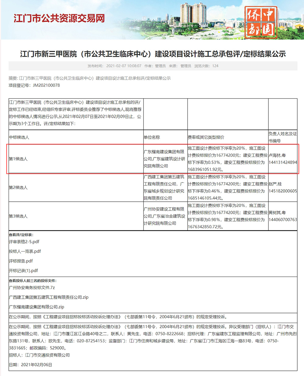 江門市新三甲醫院(市公共衛生臨床中心)建設項目設計施工總承包評/定標結果公示