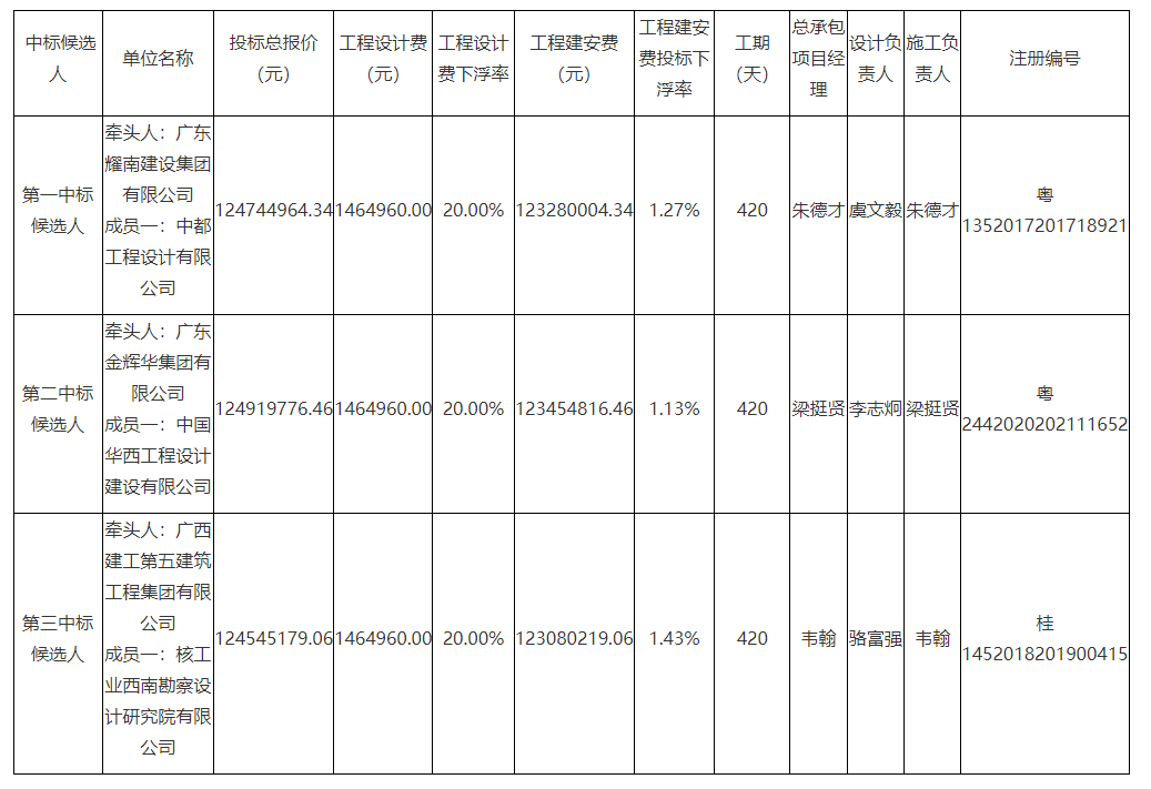 【概要描述】 開平市赤坎新區一路工程設計施工總承包評標結果公示 開平市赤坎新區一路工程設計施工總承包招標的評標工作已于二〇二二年五月十二日結束,經組織專家評審,評標委員會推薦了中標候選人,現將推薦的中標候選人情況進行公示,從二〇二二年五月十三日至二〇二二年五月十七日止,公示期為三個工作日。具體情況如下: 在公示期間,按照《工程建設項目招標投標活動投訴處理辦法》(七部委第11號令,2004年6月21頒布)的規定受理投訴。 監督部門:開平市住房和城鄉建設局? 聯系人:譚先生? ? ? 電話:0750-2233577 招標人:開平市古鎮建設投資有限公司 聯系人:何先生? ? ?電話:0750-2635216 招標代理機構:華聯世紀工程咨詢股份有限公司 聯系人:胡小姐? ? 電話:13824016230 日期:2022年5月13日 評/定標表: ? 開標記錄.pdf 評標過程資料.pdf 評標報告.pdf ? 投標人前三名的投標文件: ? 廣東耀南建設集團有限公司網上公示版.pdf 廣東金輝華集團有限公司商務標公示版.pdf 廣西建工第五建筑工程集團有限公司商務標.pdf ? ?